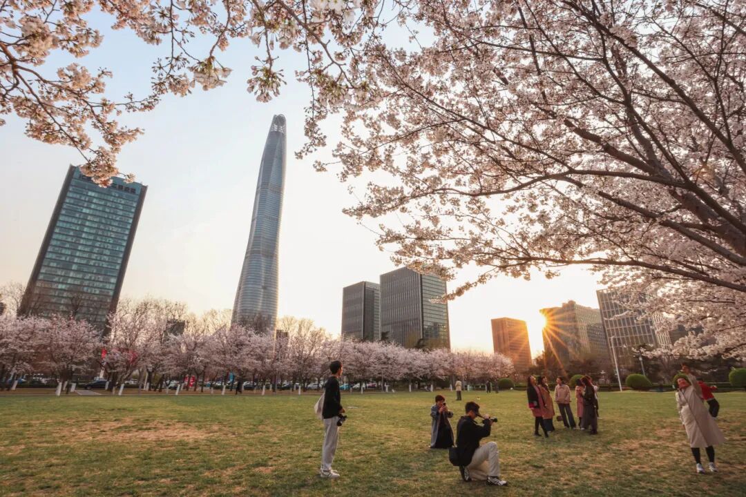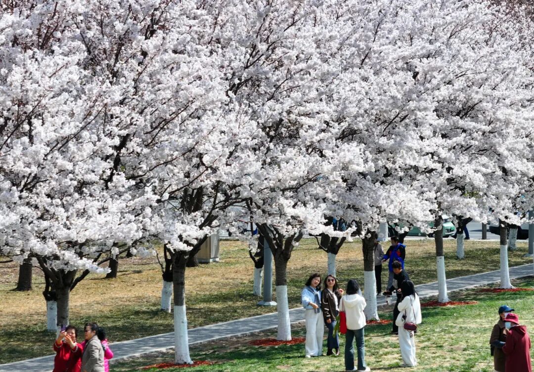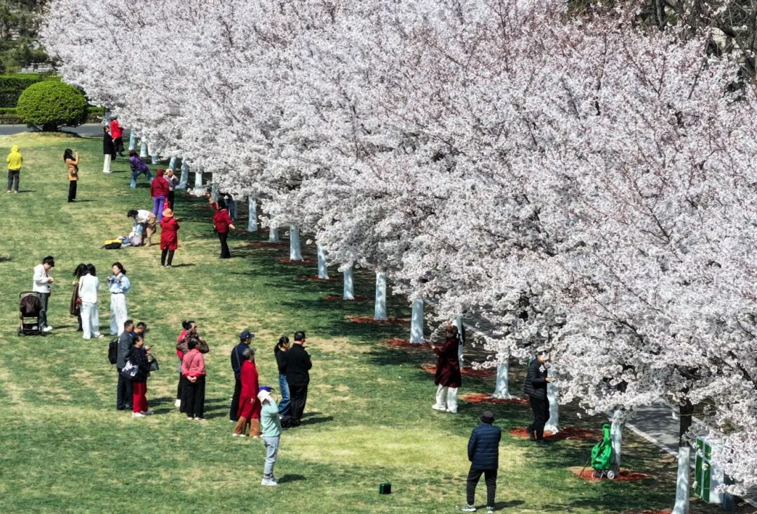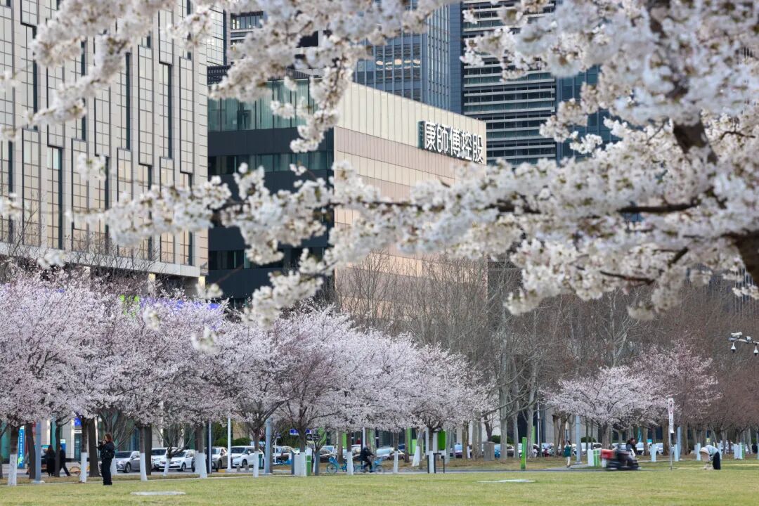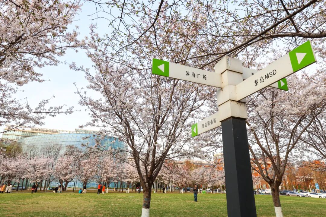 漫步在泰达城市公园,千余米的樱花长廊缀满粉白,每一步都踩在春天的心尖上。